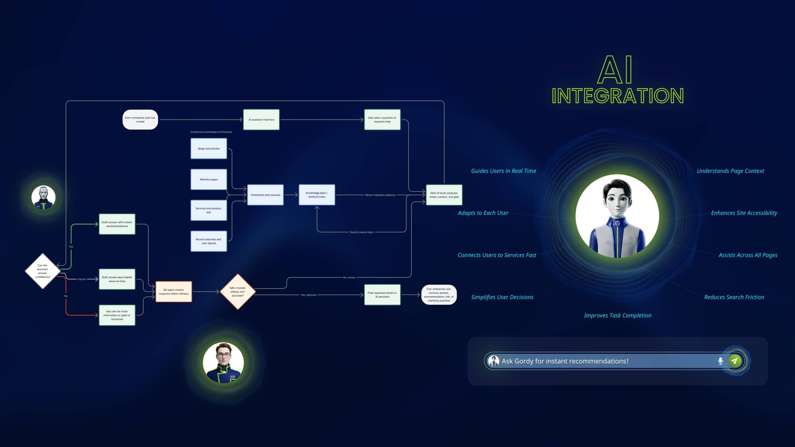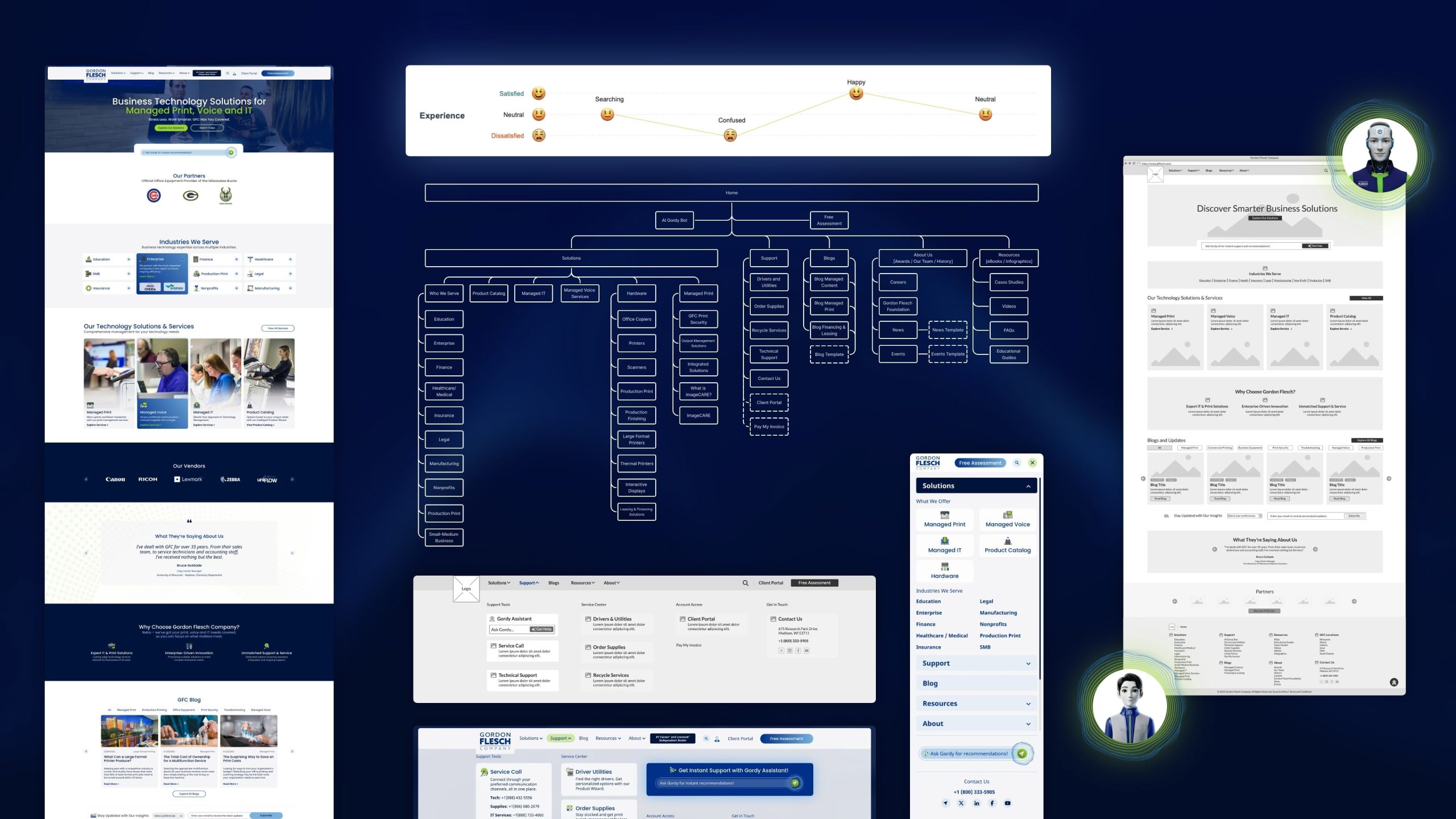 The redesign focused on improving usability and clarity across the Gordon Flesch website. The main goals were to simplify complex navigation, make it easier to distinguish between technical and service support, and introduce the “Gordy” AI assistant to enhance the overall user experience with smarter, more personalized interactions.