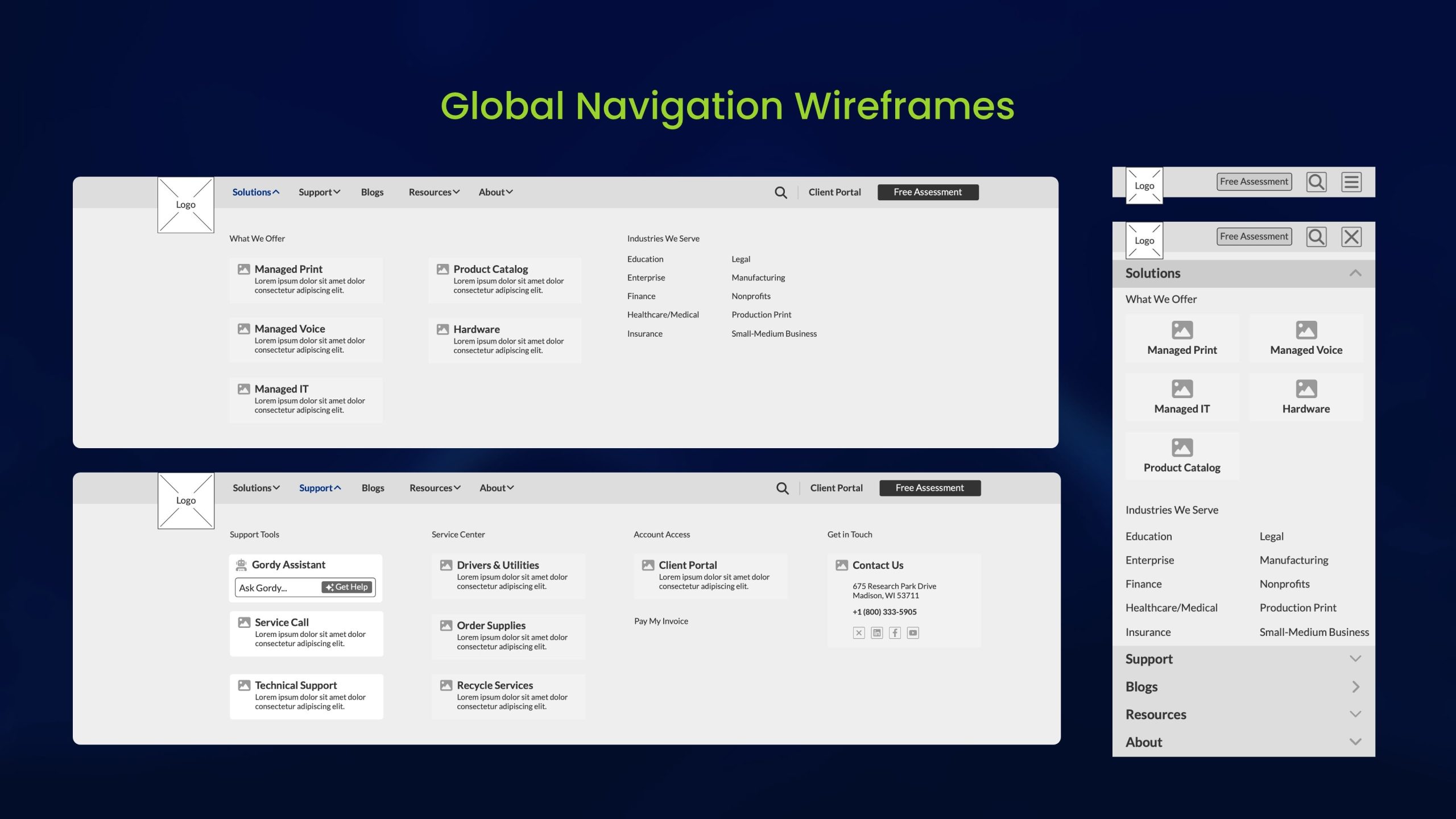 The redesigned information architecture organized content under a simplified global structure: Solutions, Support, Blog, Resources, and About. This new sitemap aligned with GFC’s 80/20 business focus, ensuring enterprise-level content appeared first and navigation remained intuitive across all user segments.