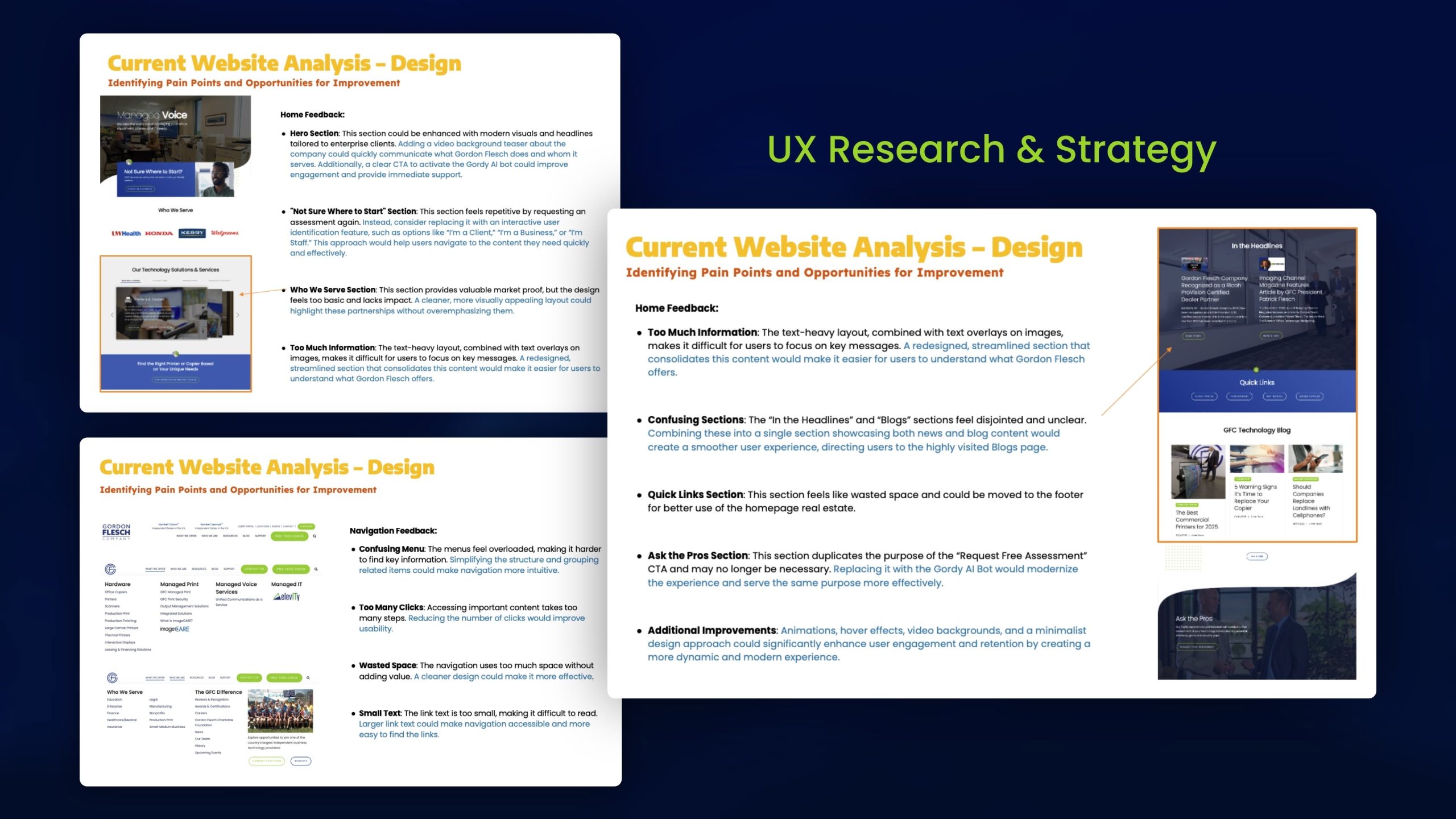 The process began with a full UX audit and heuristic analysis of the current Gordon Flesch website. I identified key usability issues including complex navigation, low-contrast CTAs, and excessive cognitive load from text-heavy layouts. This phase uncovered the foundation for improvement, simplifying structure, enhancing hierarchy, and clarifying user pathways for enterprise and SMB audiences.