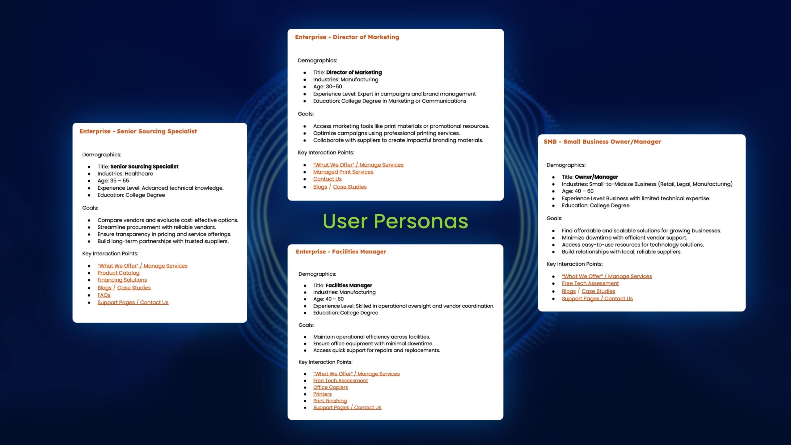 Based on research, I created five detailed user personas representing key customer types from enterprise IT directors to small business owners. Each persona included goals, frustrations, and interaction touchpoints, shaping design decisions that prioritized accessibility and tailored pathways through the website.