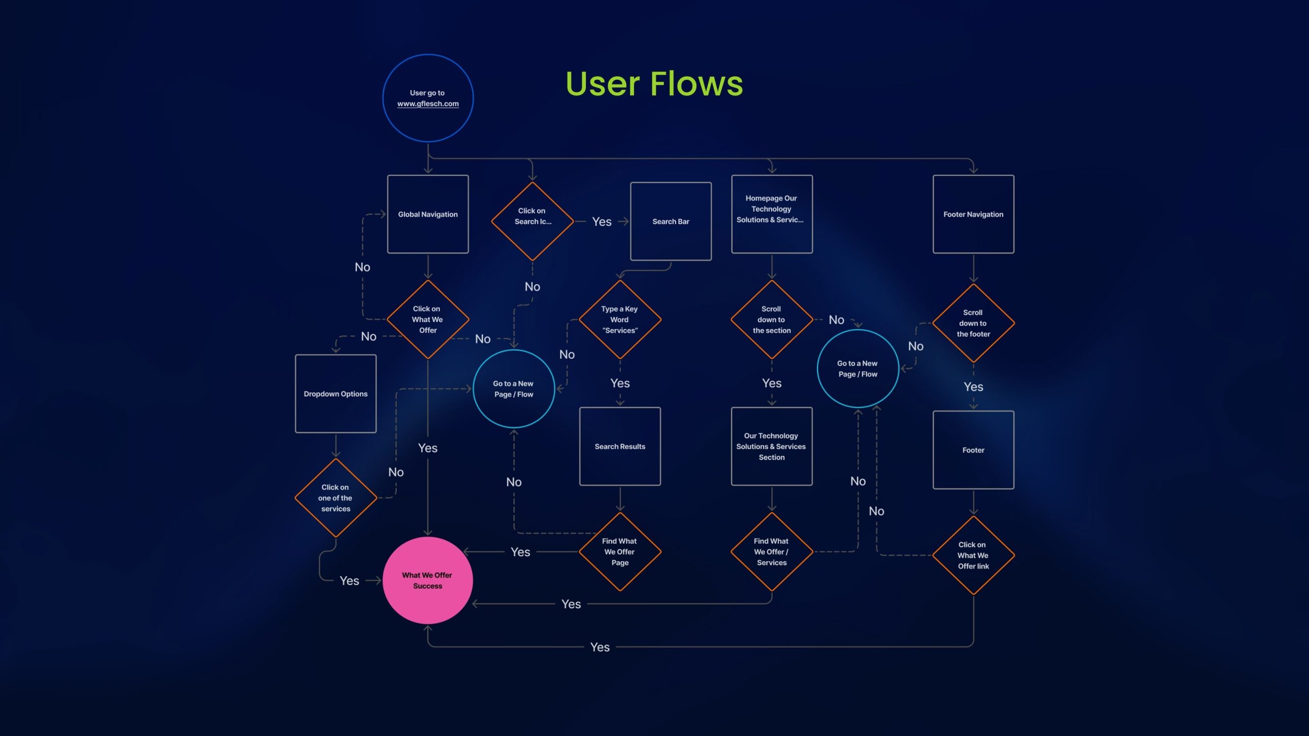 The user flow analysis uncovered fragmented navigation with multiple redundant paths. By restructuring it into a single streamlined flow for tasks such as “Accessing What We Offer,” I reduced friction, clarified actions, and improved the time to reach critical pages,  a key win for conversion efficiency.