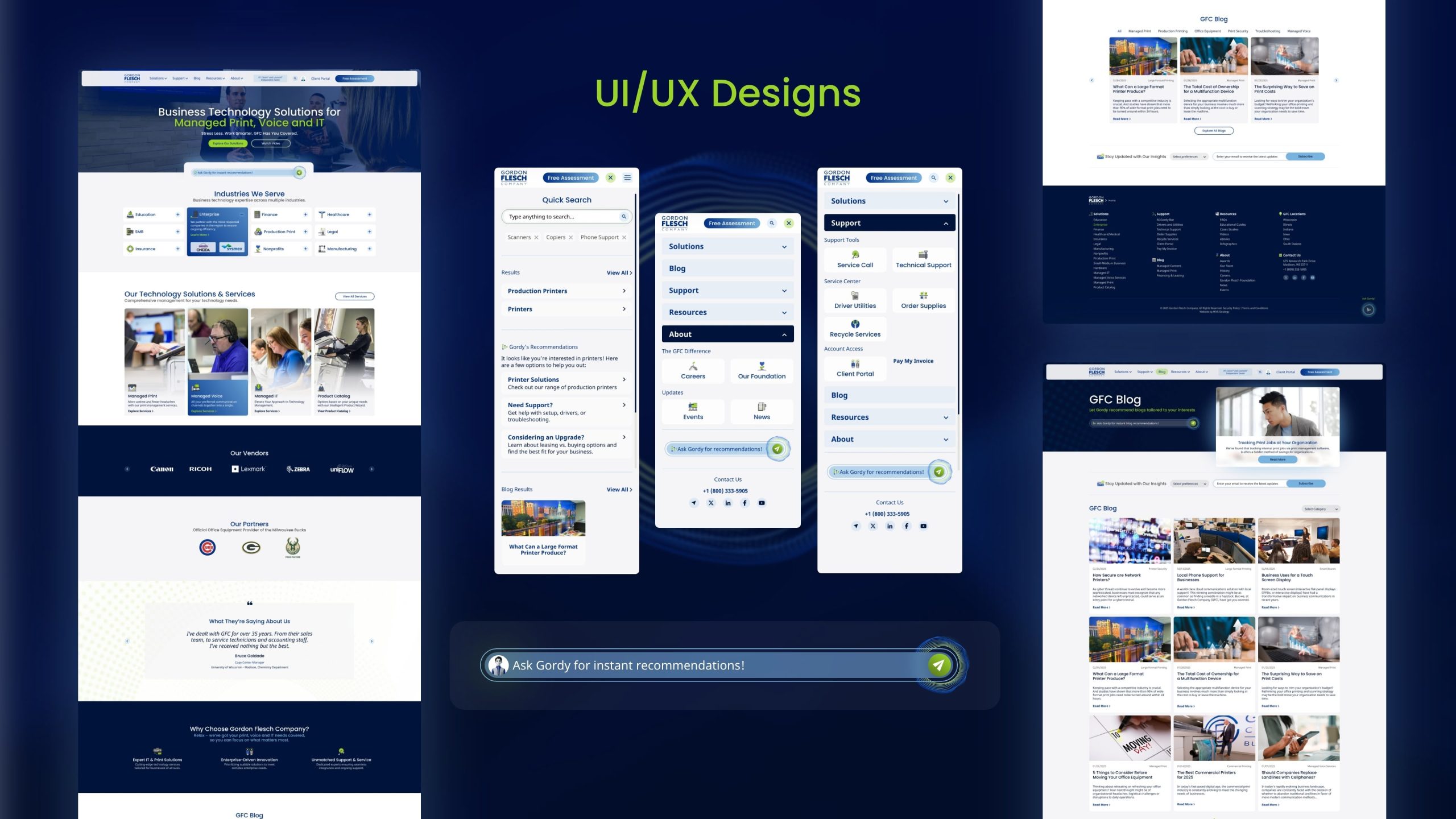 At the core of the Gordon Flesch redesign is Gordy, an AI-powered virtual assistant that redefines how users interact with the website. Designed from the insights uncovered during UX research, Gordy was built to solve one of the most common frustrations, users struggling to find the right service, support, or information path quickly. By integrating Gordy into the site’s architecture, the experience became more intuitive, personal, and self-guided. Whether a visitor is exploring solutions, reading blogs, or seeking technical help, Gordy delivers real-time recommendations, guiding them to the right content in fewer clicks.