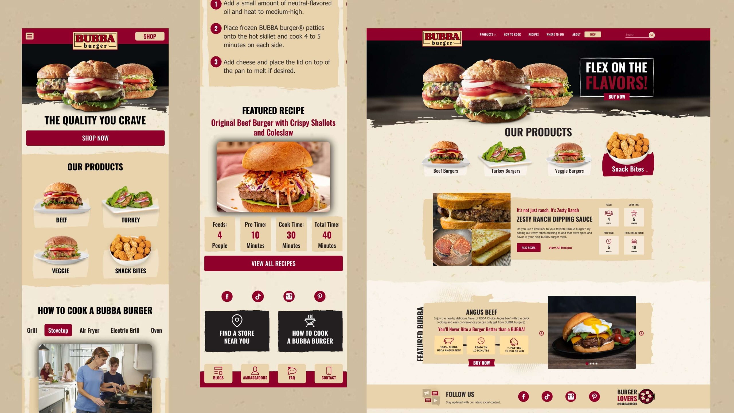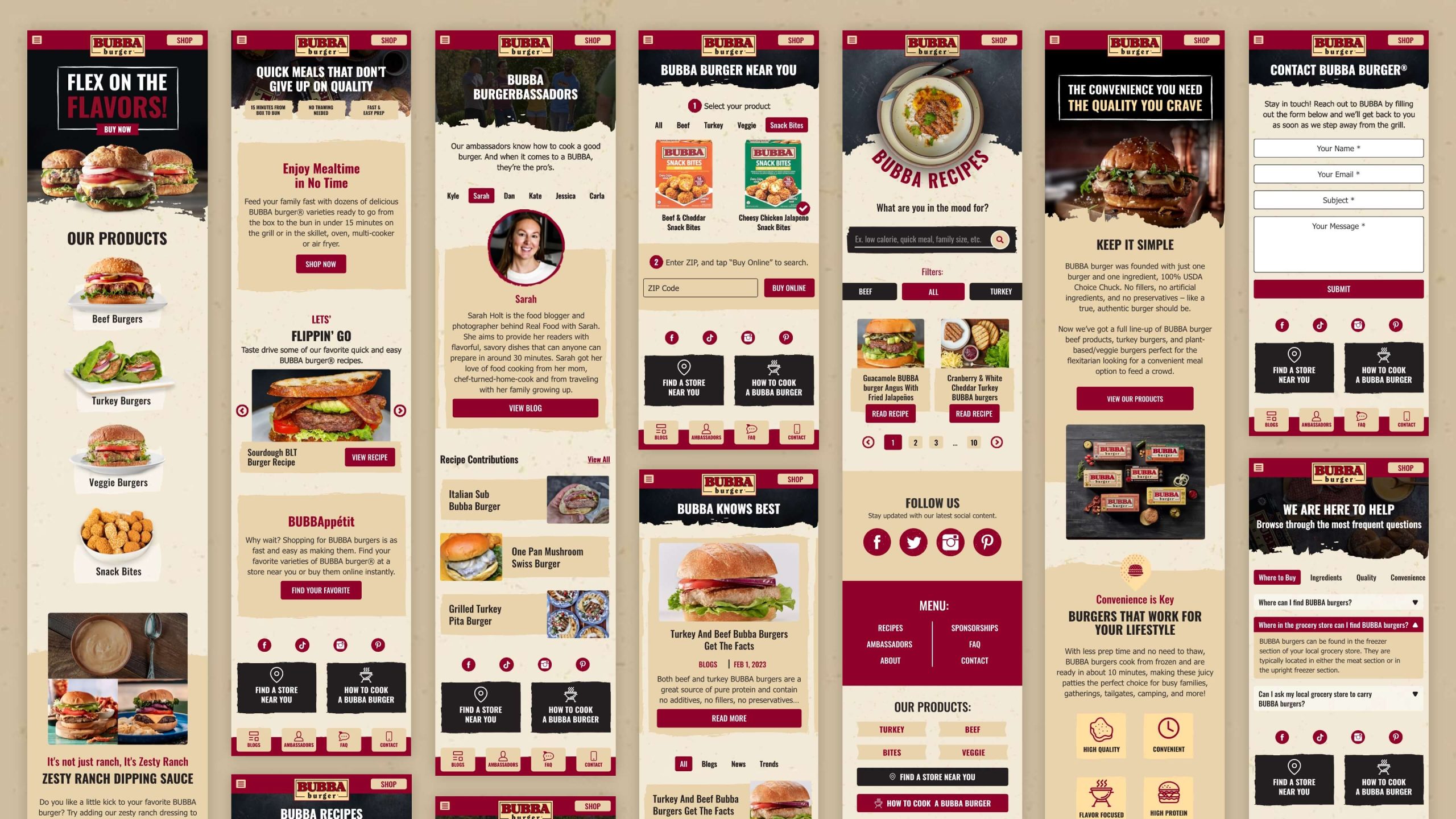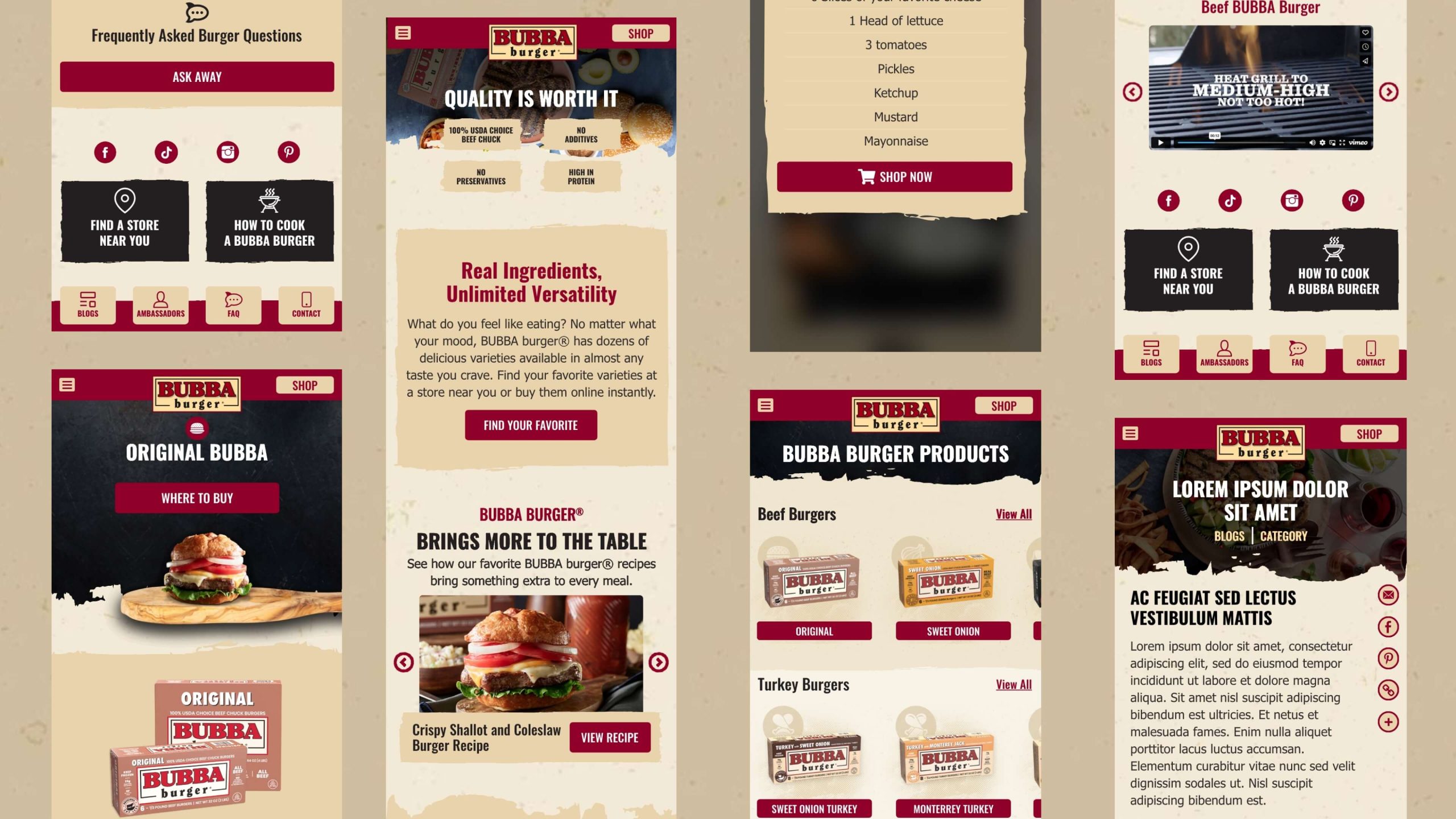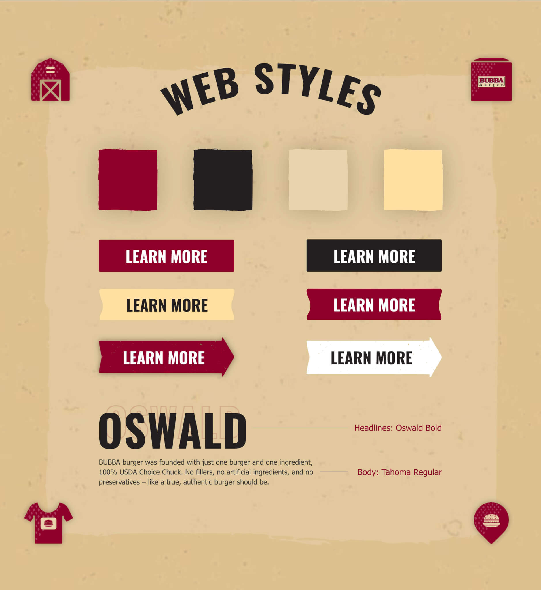 For BUBBA Burger’s website redesign, I crafted a cohesive and visually engaging style guide that reflects the brand’s personality. This included designing modern layouts, selecting a bold and inviting color palette, and creating custom graphic elements to enhance the overall aesthetic and align with BUBBA Burger’s identity.
