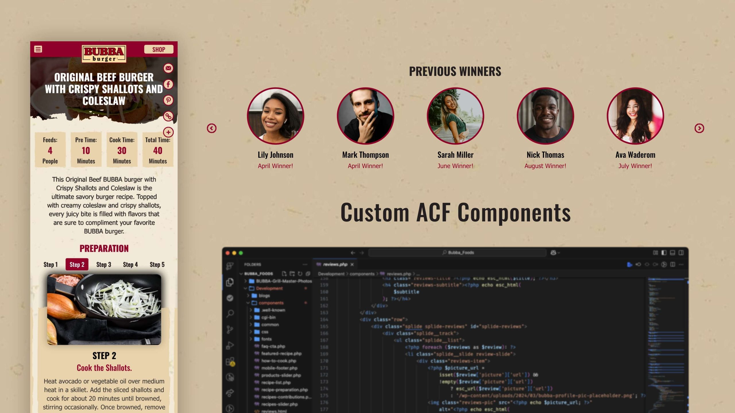 As part of 5ivecanons, I contributed to the redesign and custom development of the BUBBA Burger website. In my role as Senior Front-End Designer and Developer, I was responsible for UI/UX design, custom coding, motion design tailored to the brand’s needs. A key aspect of the project was creating and implementing custom ACF templates for each page, ensuring a seamless and dynamic user experience.