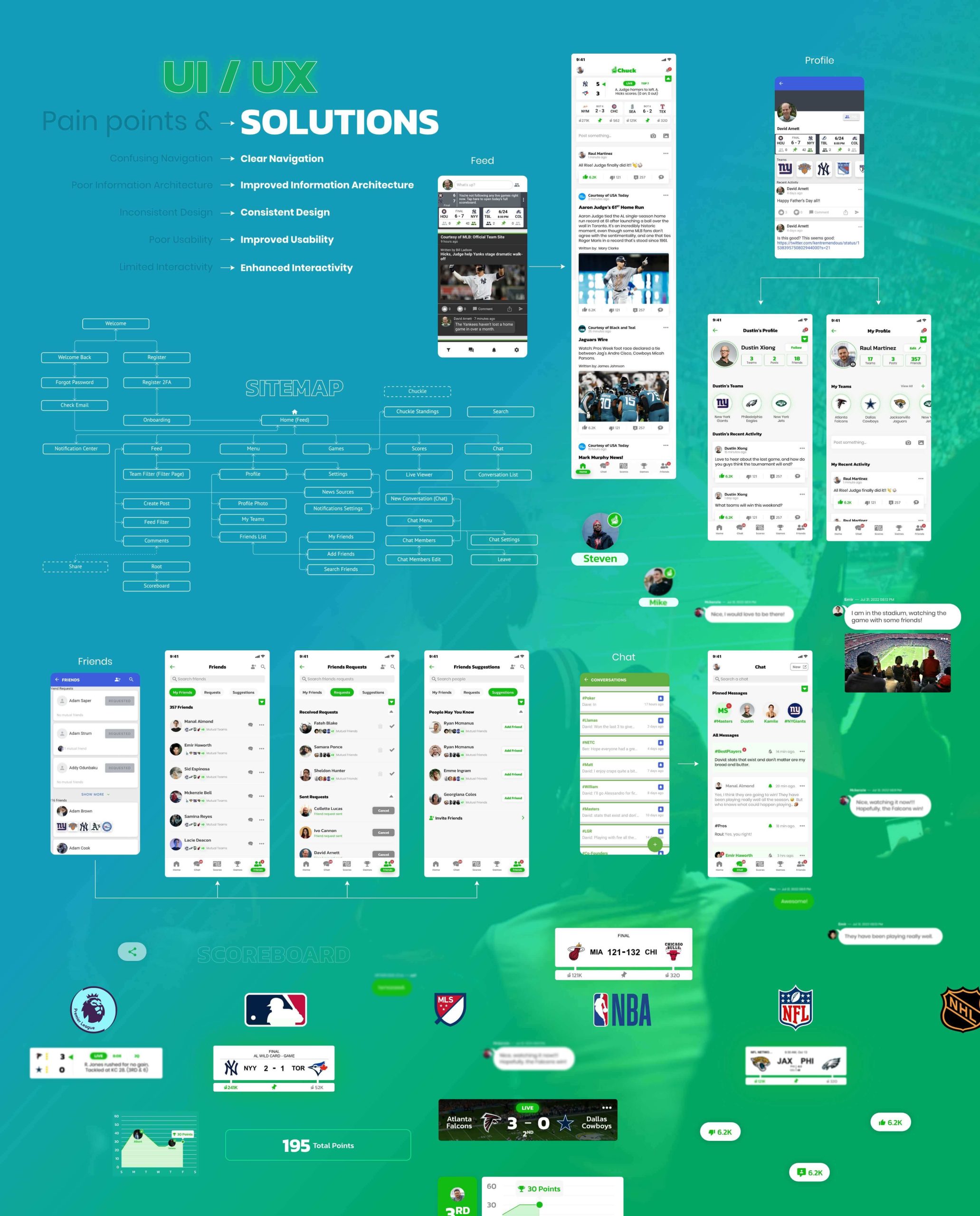The Chuck mobile app redesign aimed to provide sports fans with a more engaging and informative platform for staying up-to-date and connecting with fellow fans. As a consultant and UI/UX Senior Designer, I contributed to all stages of the design process, from user research and information architecture to interaction and visual design, resulting in an improved user experience.