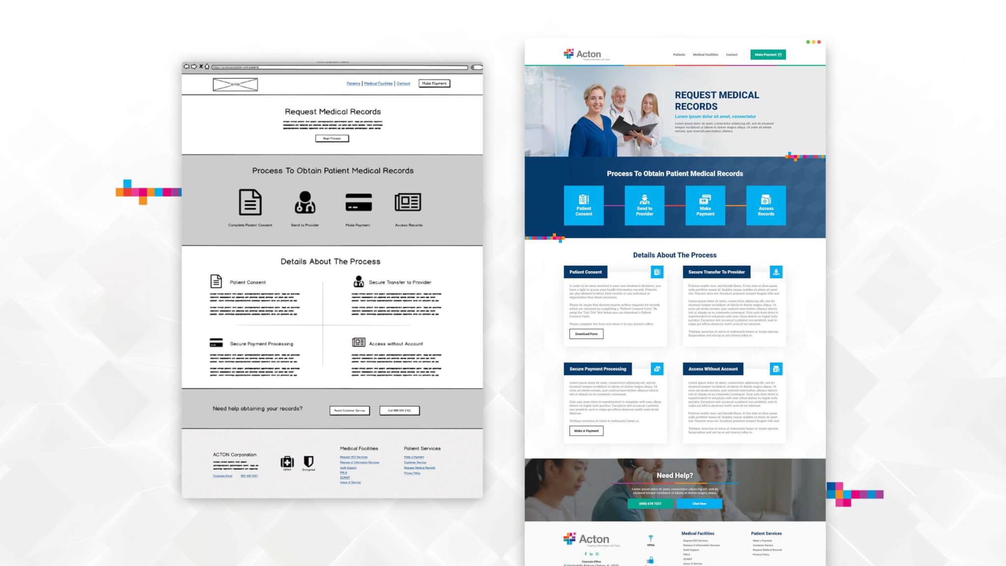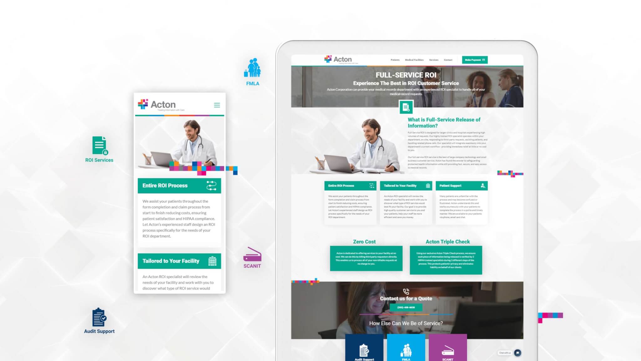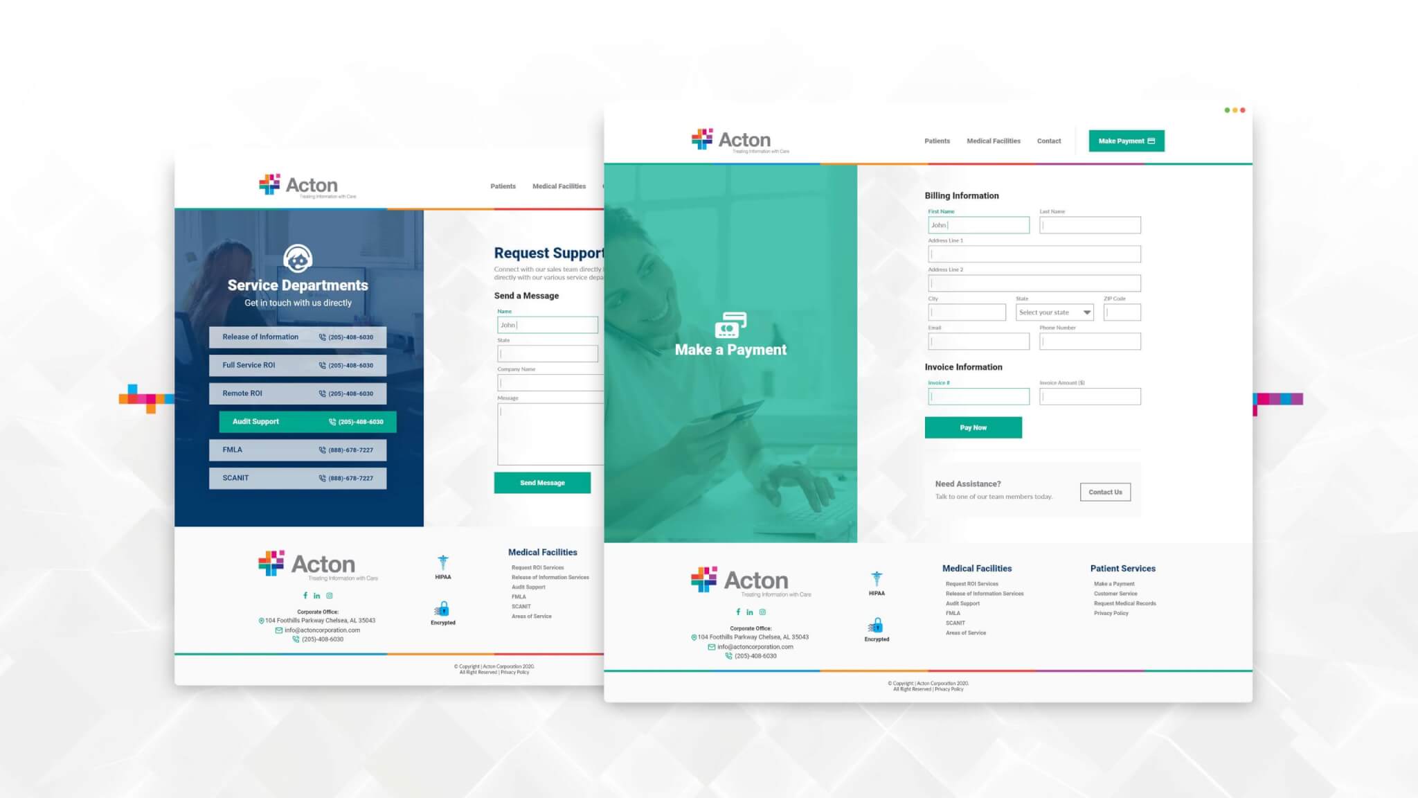 The project began with research into Acton Corporation’s services, branding, and provided assets. Following this analysis, a colleague developed wireframes, with which I then collaborated to refine the user navigation flow. I subsequently designed the web styles and UI/UX, focusing on creating a clean, modern, and secure online experience tailored to the medical field.