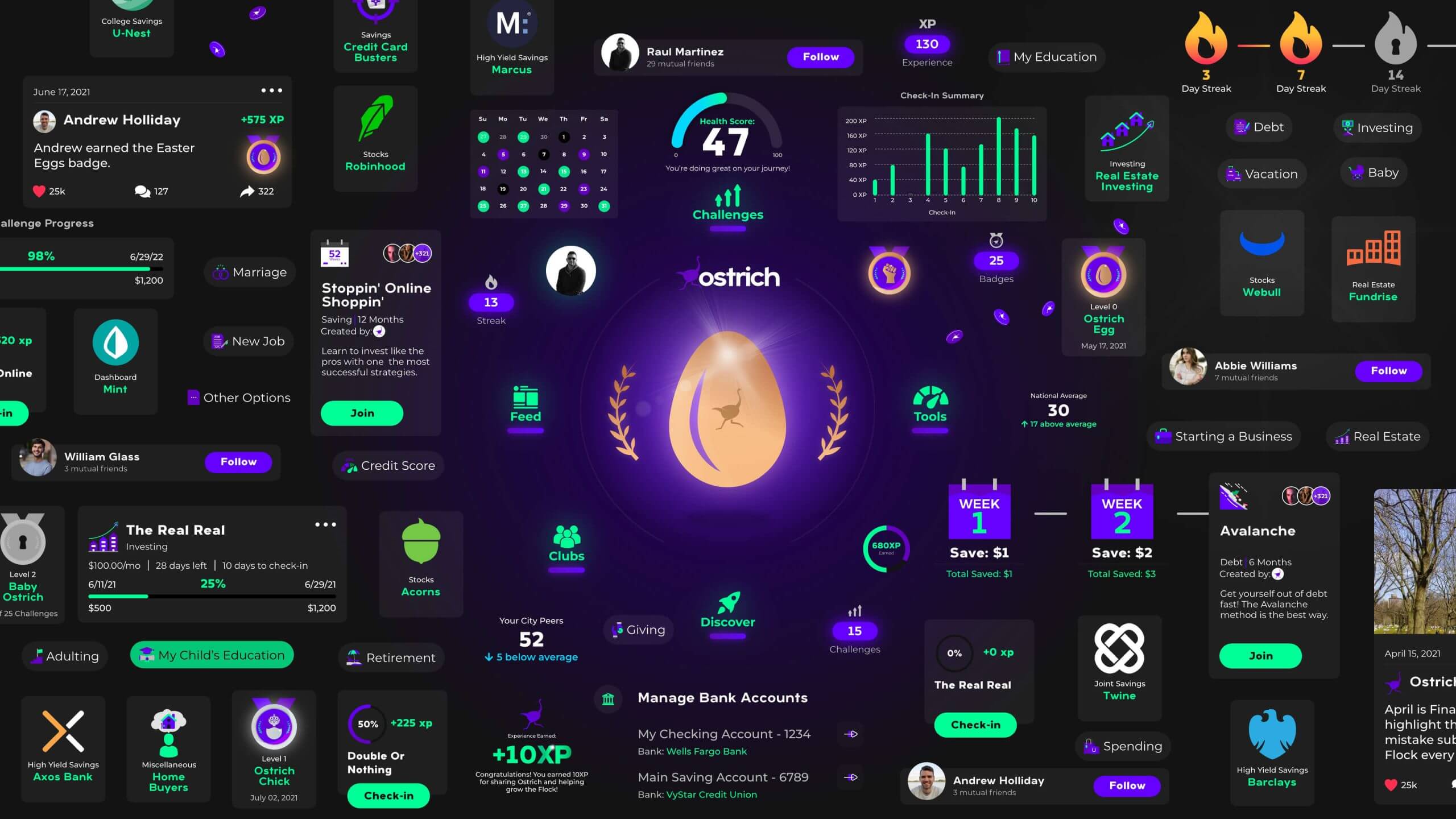 The Ostrich app sought to revolutionize how users engage with their finances through gamification. My work as Consultant, UX / UI Designer and Front-End Developer on this project contributed to creating a seamless and motivating user experience.