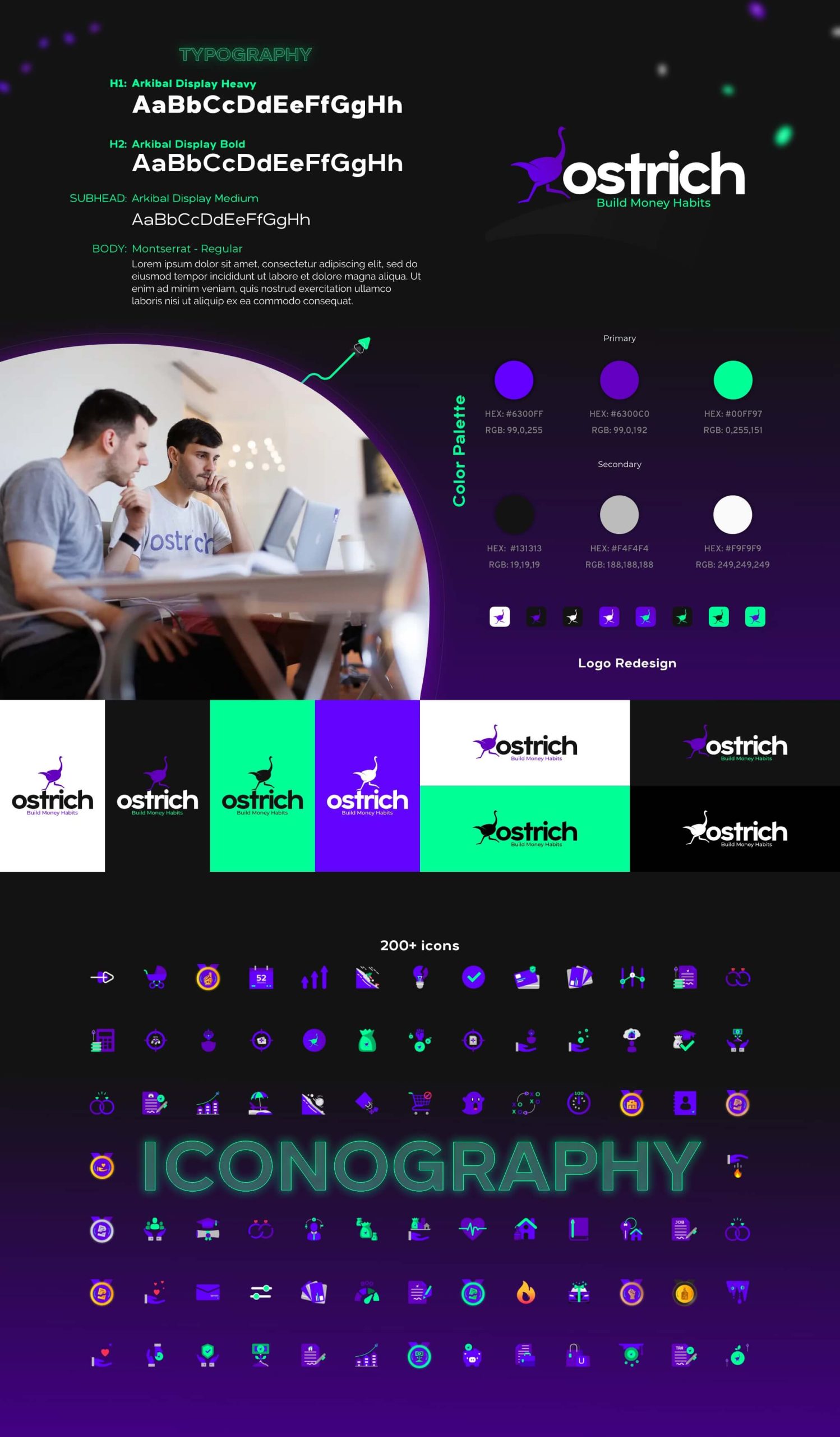 The visual identity for Ostrich was designed to reinforce the brand message of “Build Money Habits.” The “Ostrich” logo was designed to be memorable and easily recognizable, creating a strong brand presence. The overall design balances visual appeal with clear readability, supporting a friendly and approachable tone, which is crucial for engaging users in the often-intimidating world of finance.