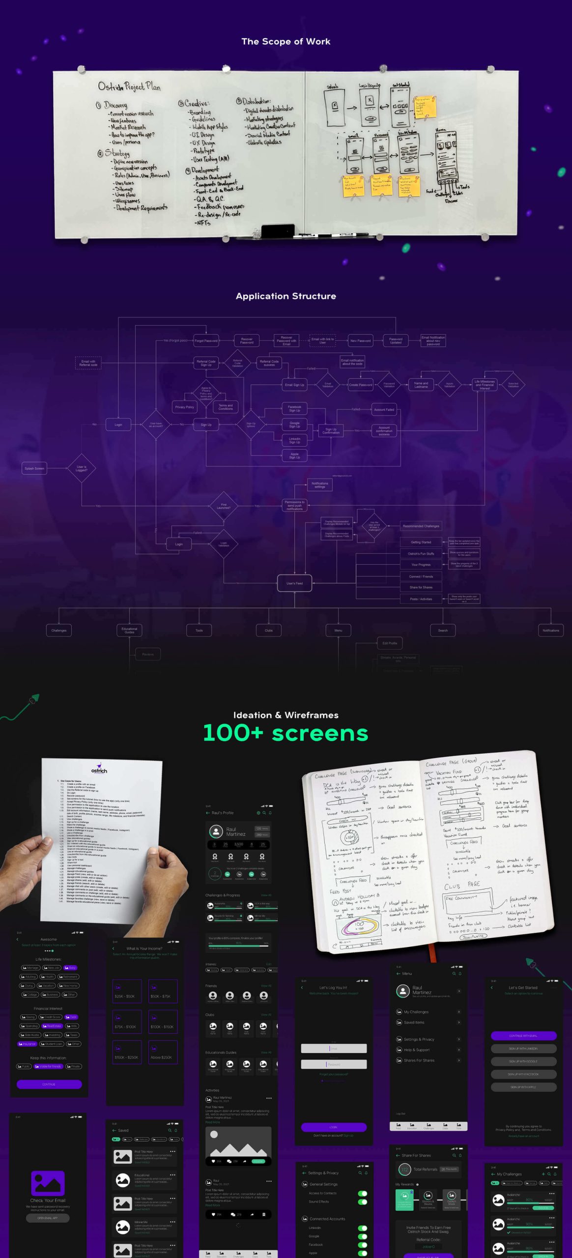 I then developed a detailed application structure flowchart to define the information architecture (IA) and user flows, ensuring intuitive navigation. This groundwork informed the creation of over 100 wireframes, detailing the UI elements and interactions across various screen sizes and devices.