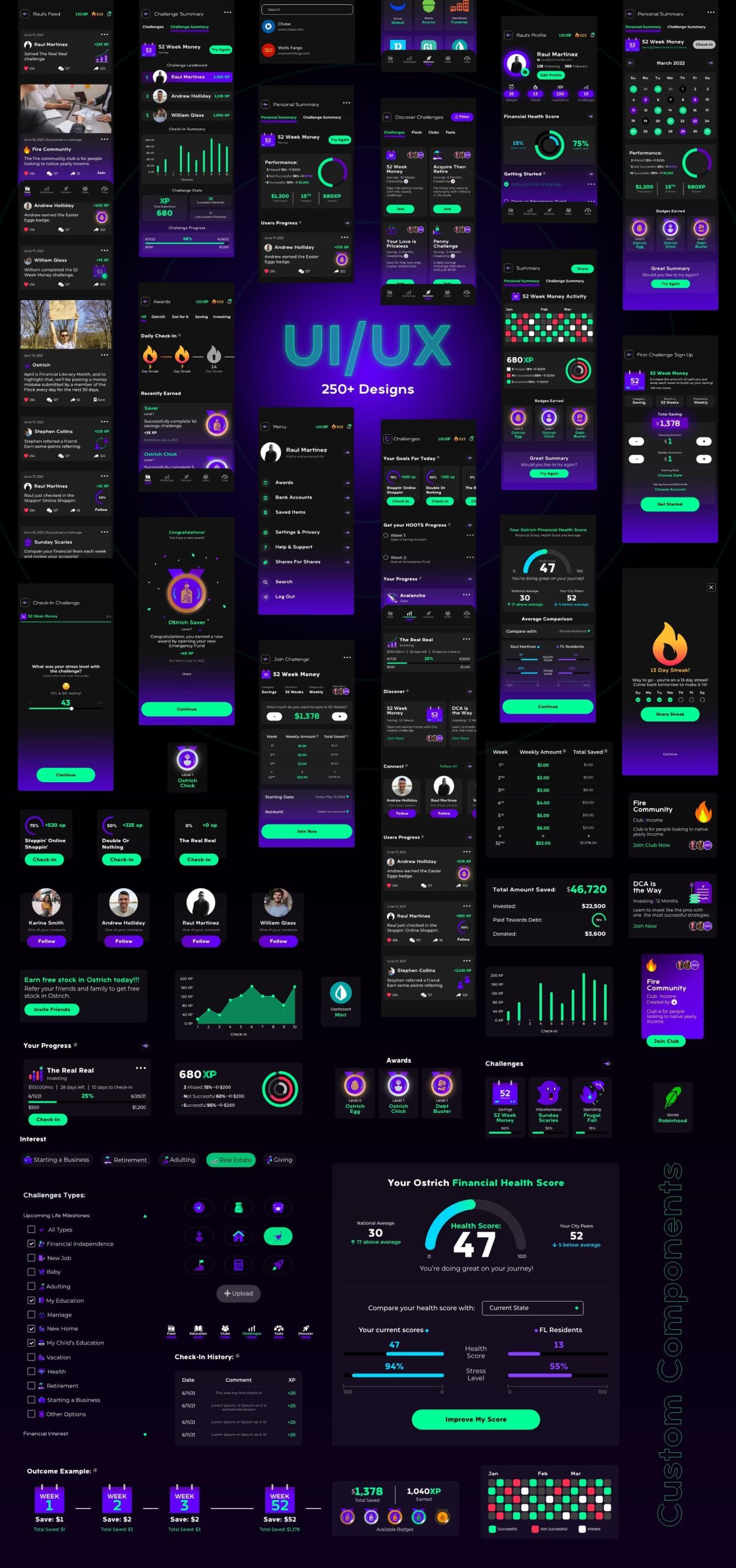 I designed 250+ UI components and implemented a suite of gamification features and custom UI components to make managing finances more enjoyable and rewarding for users. This involved creating interactive elements like progress bars, leaderboards, and personalized challenges. I carefully considered the psychology of gamification, incorporating elements that motivate users to actively participate and achieve their financial goals. This approach transforms the often-intimidating task of managing finances into a more engaging and enjoyable experience.