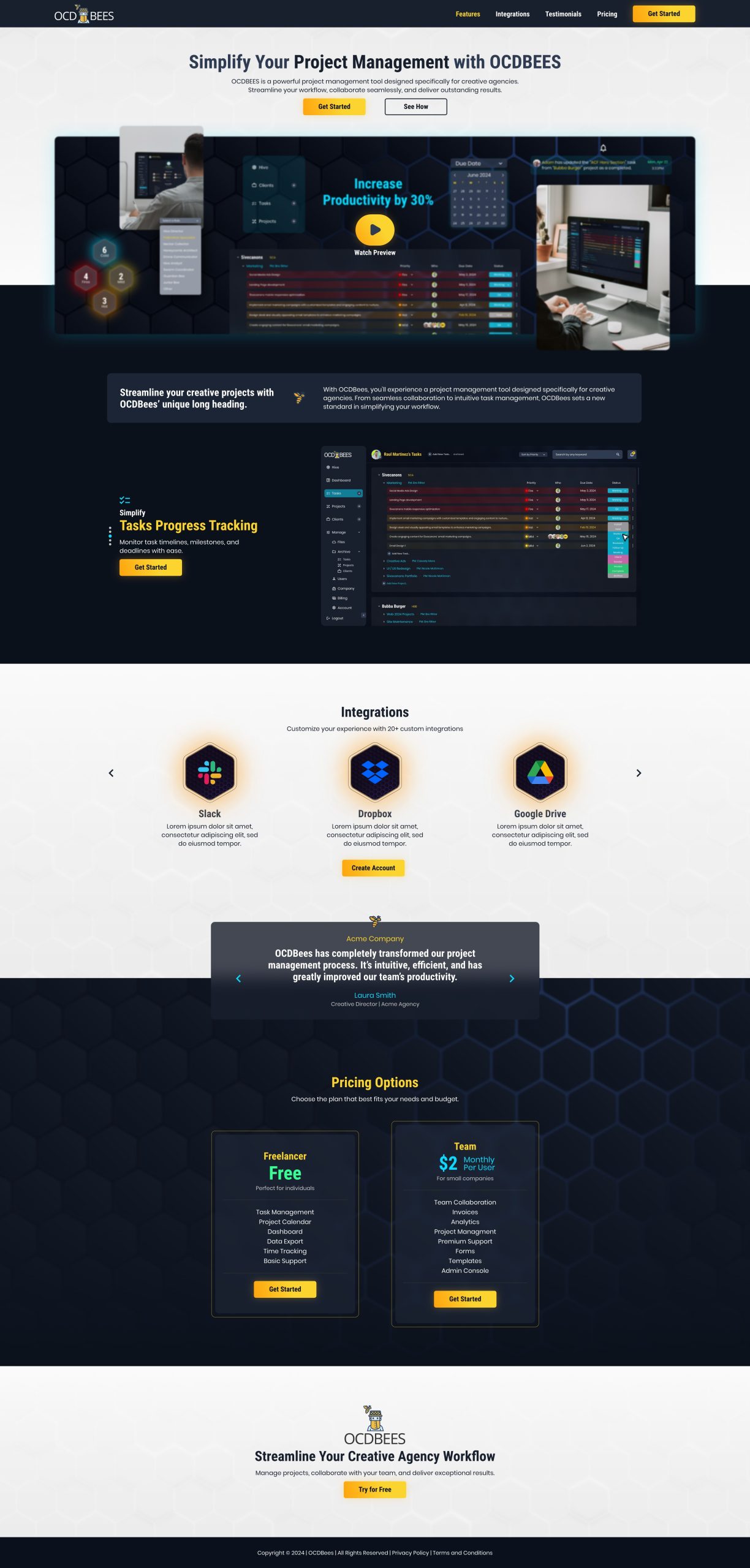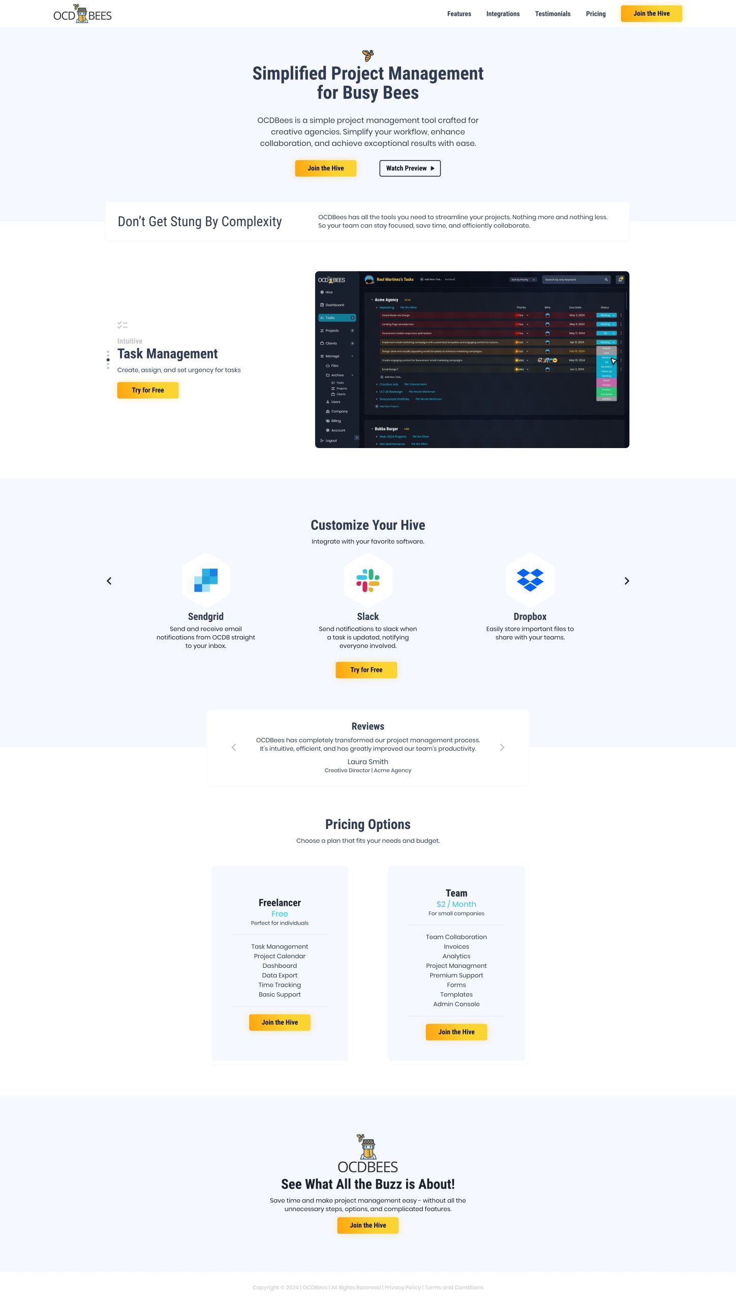 In addition to the UI/UX design for the OCDBees platform, I also conceptualized and designed the marketing website. The marketing page was crafted to effectively communicate OCDBees’ unique value proposition, highlight its key features, and drive user engagement. With a clean layout, compelling visuals, and intuitive navigation, the site guides potential users through the tool’s benefits and encourages sign-ups with clear CTAs.