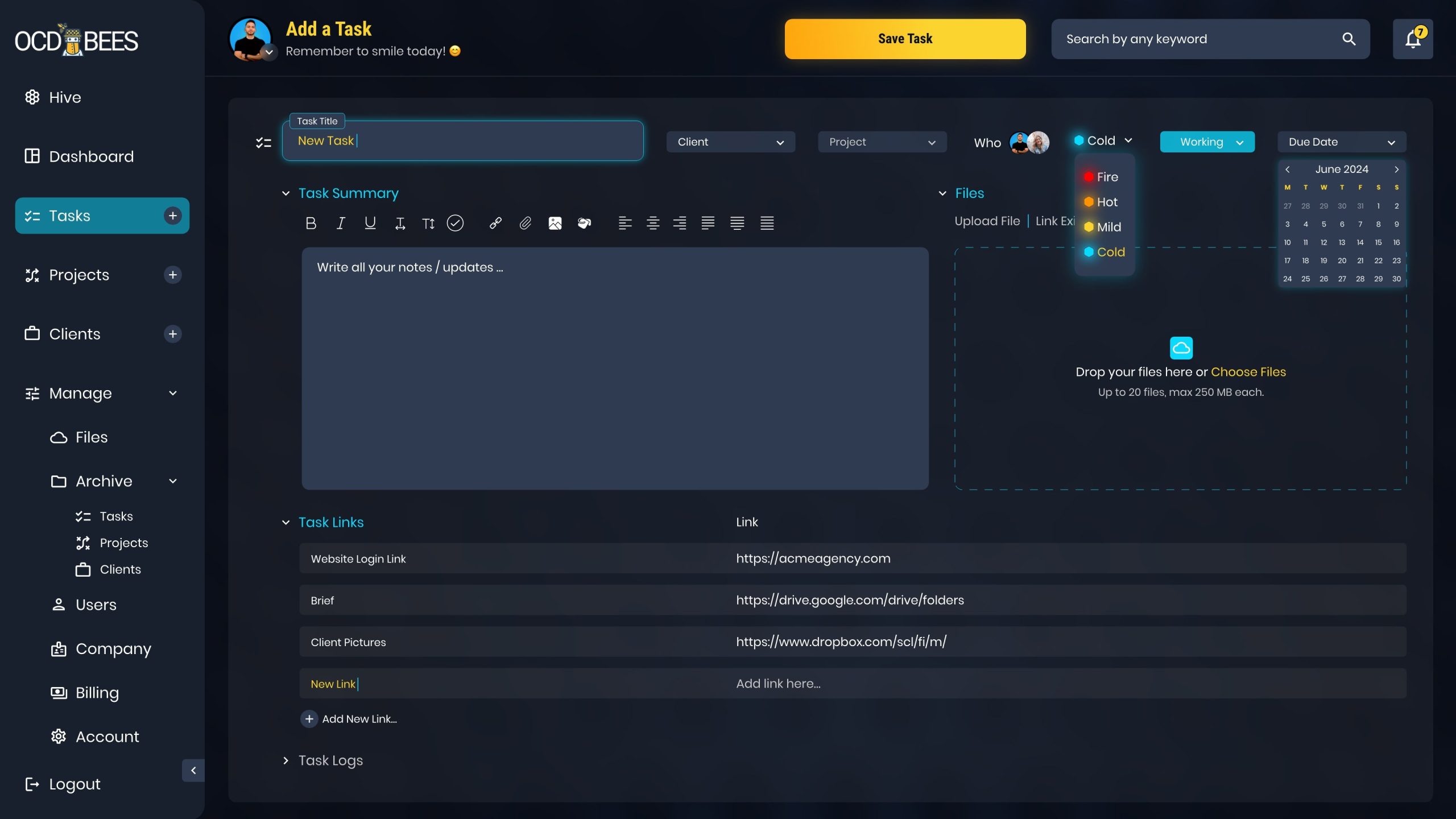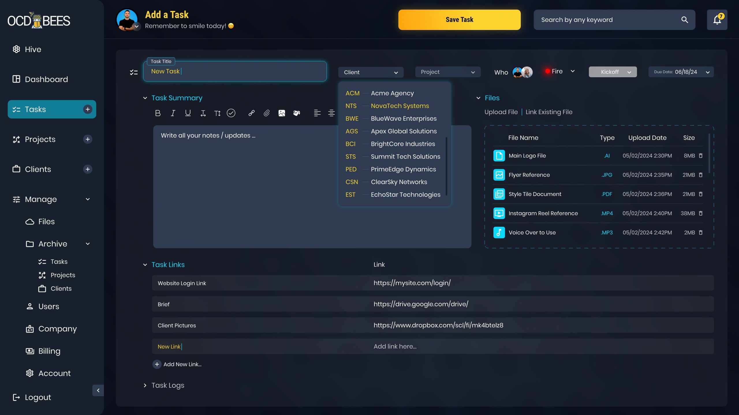 The task creation process includes adding task names, assigning team members, selecting companies and projects, setting priorities and due dates, using a WYSIWYG editor for summaries, and creating custom checklists. Additionally, users can manage files, link resources, and track detailed task logs for full transparency. This intuitive design simplifies complex workflows while ensuring an efficient and user-friendly experience.