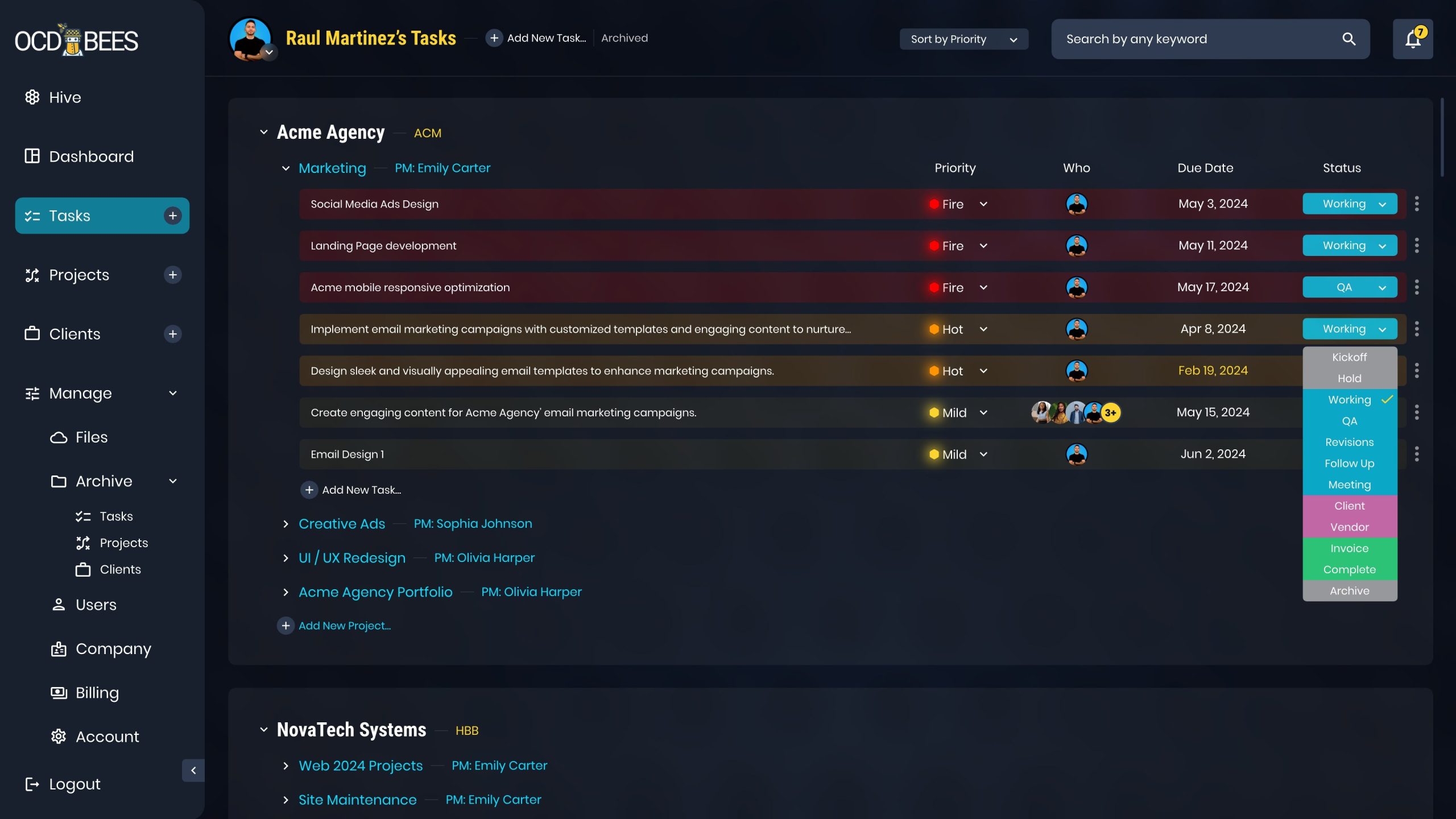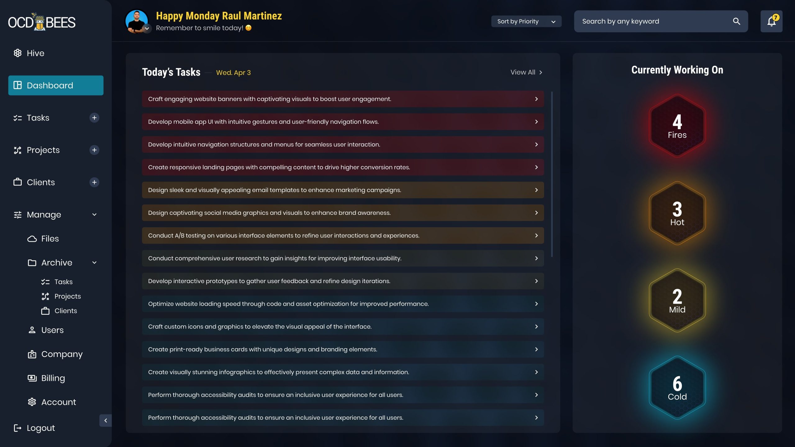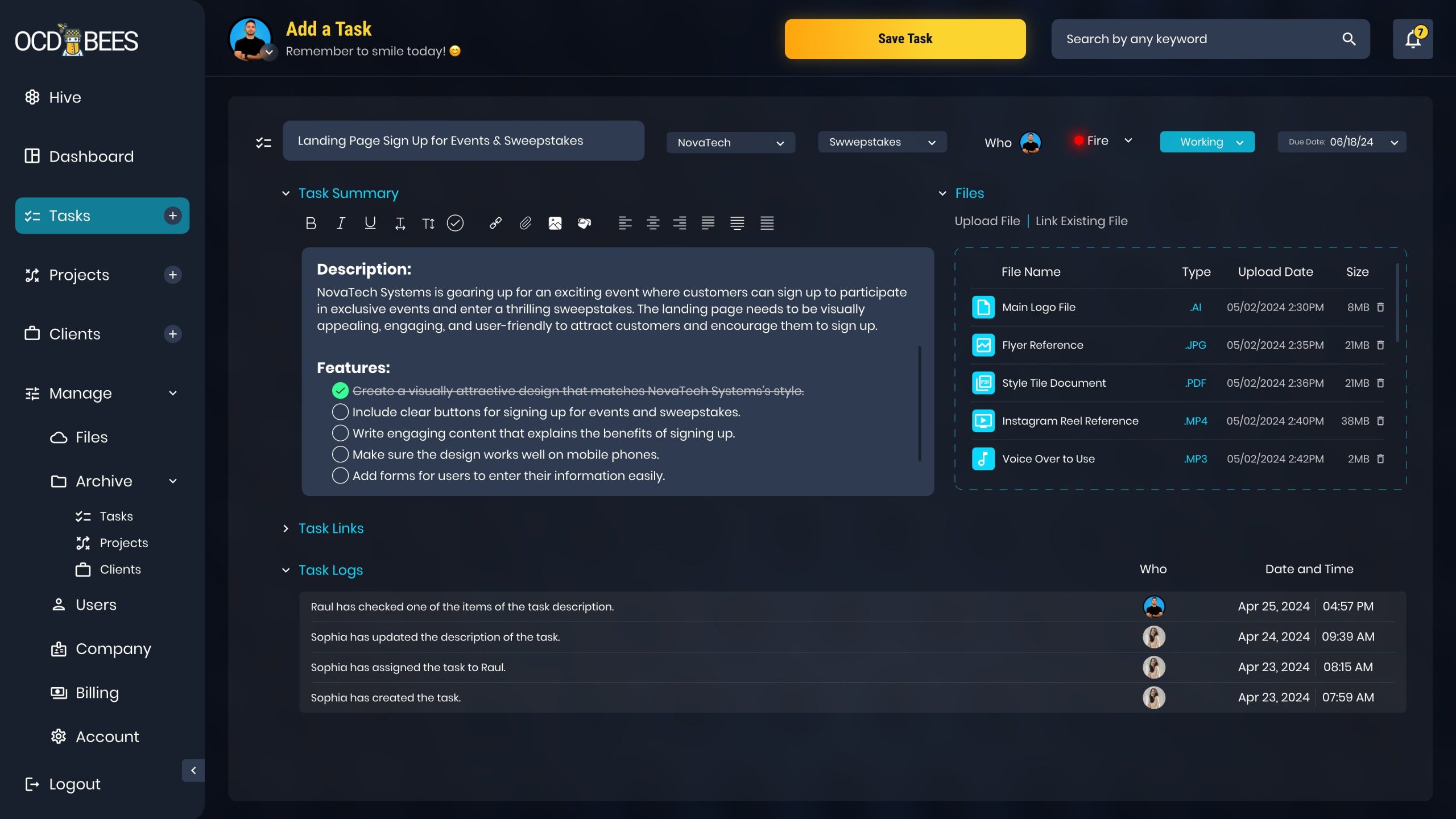 As a Senior UI/UX Designer, I crafted a robust Task Flow for OCDBees to streamline task management with clarity and usability. Users can easily identify tasks by priority, status, and due date, enhanced with color-coded visuals for quick recognition.
